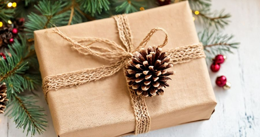 A cozy brown box wrapped in burlap with a pinecone ornament.